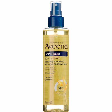 Aveeno Skin Relief Body Oil Spray helps relieve and repair very dry skin from the first application by providing a long-lasting moisturisation . Its unique formula contains oat oil and jojoba oil, which are ingredients rich in lipids and fatty acids that help restore the skin barrier . This body oil is fast absorbing and leaves behind a silky finish . Aveeno Skin Relief Body Oil Spray is suitable for very dry, sensitive skin and can be used for a massage . Its unique formula is tested on all skin tones and is hypoallergenic*.